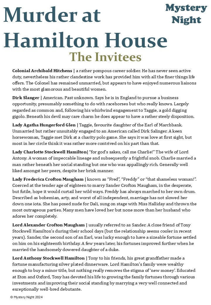 It's 1938 and Lady Stockwell Hamilton has invited you to a rather cosy weekend gathering at the Stockwell Hamilton country estate in the Cotswolds. Only the most interesting guests are invited… Lady Stockwell Hamilton, a wonderful hostess but a frightful snob, her husband Lord Anthony, devilish good at making money as long as no questions are asked... Lady Frederica Crofton Maugham, a well-bred aristocrat, not that you’d know it by her frisky antics. Her husband Lord Alexander, rather too fond of card games and drink. Colonel Archibald Hitchens, a career soldier who doesn’t let patriotism get in the way of profit. And finally Lady Agatha Hunderford Glen, favourite daughter of the Earl of Marchbank. She is unmarried, but rather unsuitably engaged to an American called Dirk Salinger, who of course will also be attending.